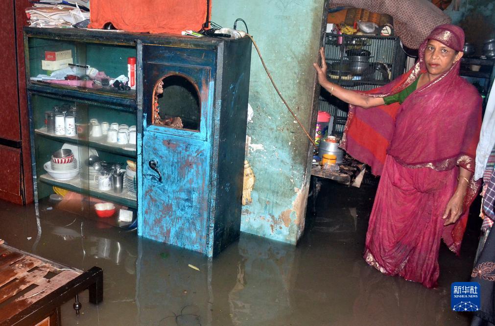 8月6日,在孟加拉國吉大港,一名女子站在積水的房屋內。