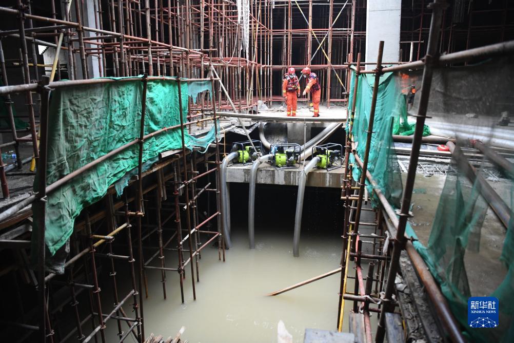 8月7日,邢臺市消防救援支隊隊員在河北省涿州市一處工地查看排澇作業(yè)情況。