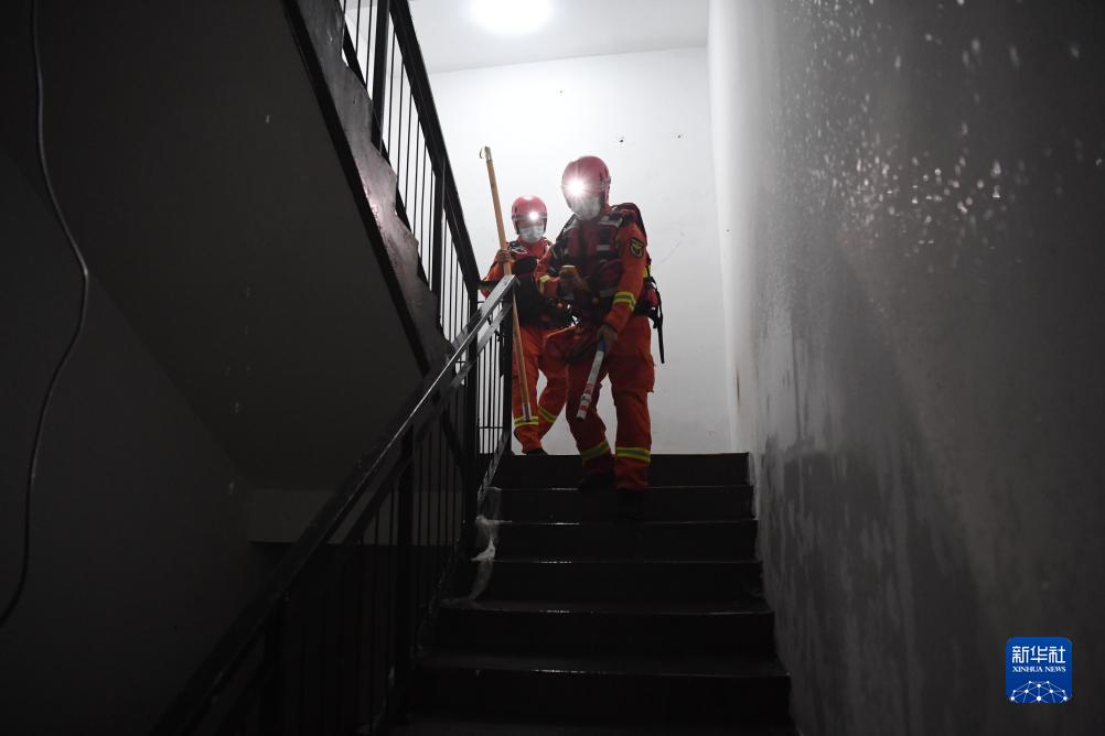 8月7日,邢臺市消防救援支隊隊員在河北省涿州市一處寫(xiě)字樓地庫查看積水情況。