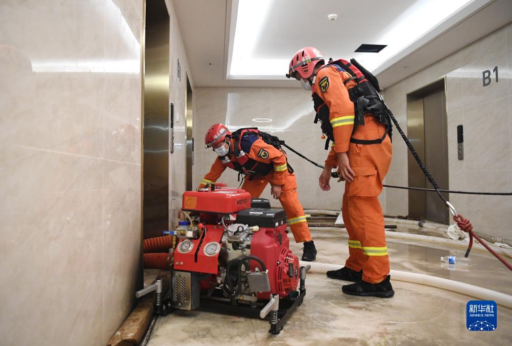 8月7日,邢臺市消防救援支隊隊員在河北省涿州市一處寫(xiě)字樓電梯井進(jìn)行排澇作業(yè)。