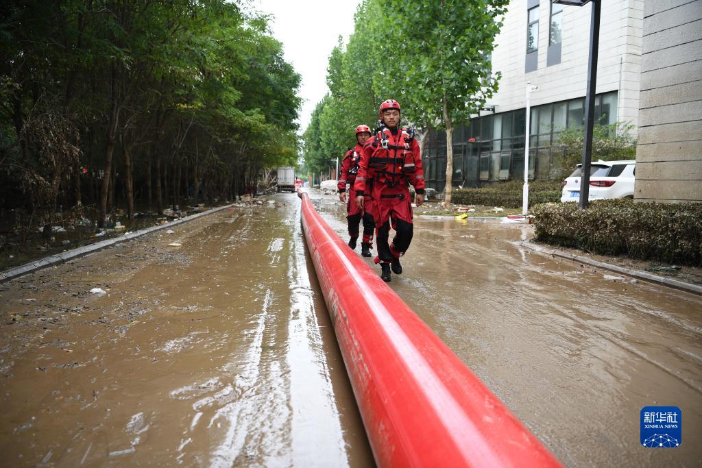 8月7日,唐山市消防救援支隊隊員在河北省涿州市市區內進(jìn)行排澇作業(yè)。
