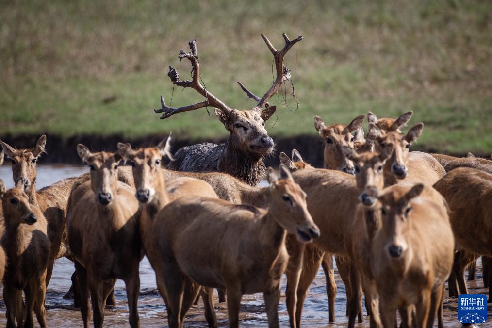 8月1日,一群麋鹿在湖北石首麋鹿國家級自然保護區內活動(dòng)。