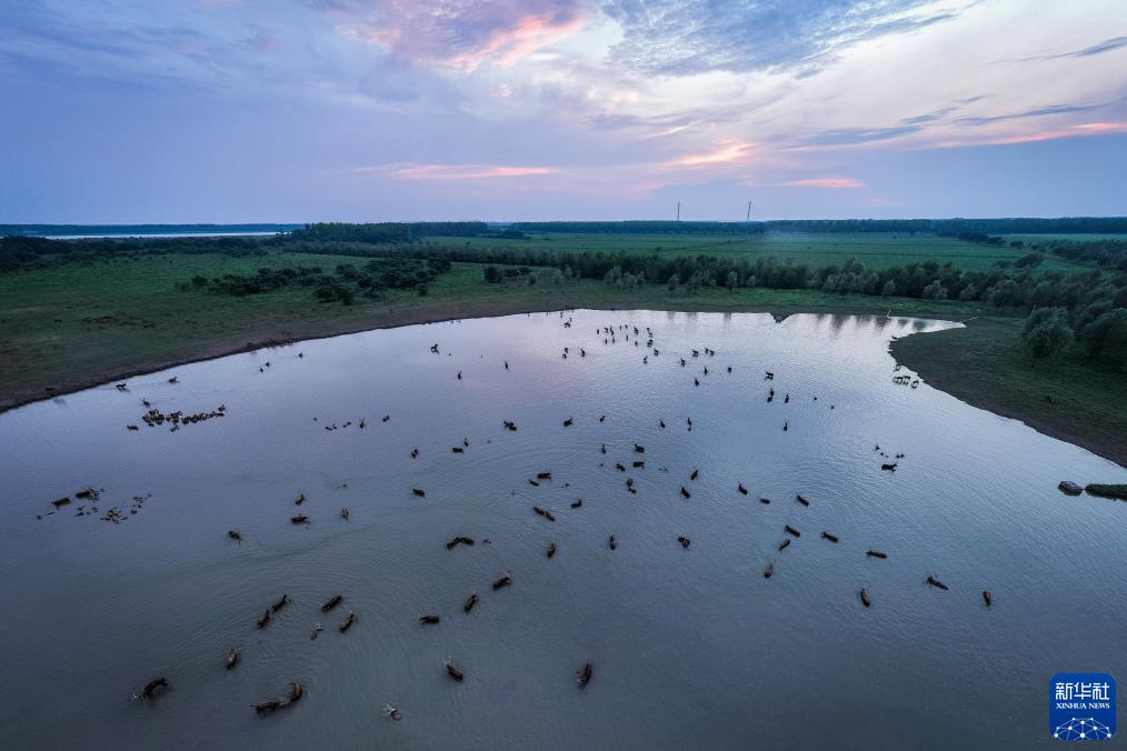 7月31日,一群麋鹿在湖北石首麋鹿國家級自然保護區內活動(dòng)(無(wú)人機照片)。