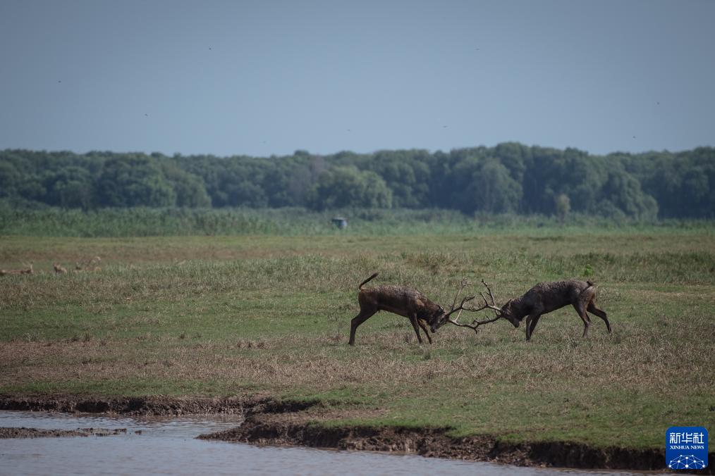 8月1日,兩頭雄鹿在湖北石首麋鹿國家級自然保護區內爭斗。