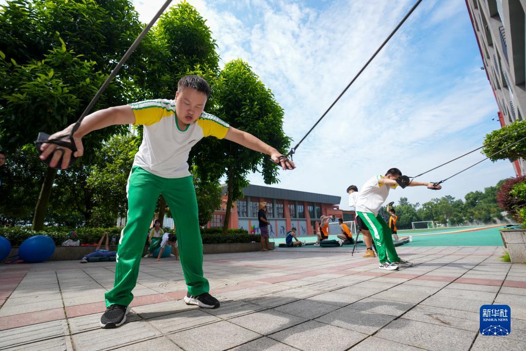 8月4日,重慶市特殊教育中心游泳隊隊員謝長(cháng)江(左一)和隊友們一起在學(xué)校操場(chǎng)進(jìn)行游泳基本動(dòng)作練習。