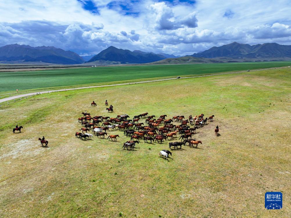 這是8月6日在山丹馬場(chǎng)一場(chǎng)有限責任公司拍攝的馬群(無(wú)人機照片)。