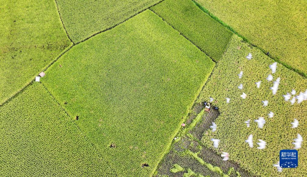 8月6日,四川省瀘州市江陽(yáng)區況場(chǎng)街道紅山村村民在收割水稻(無(wú)人機照片)。