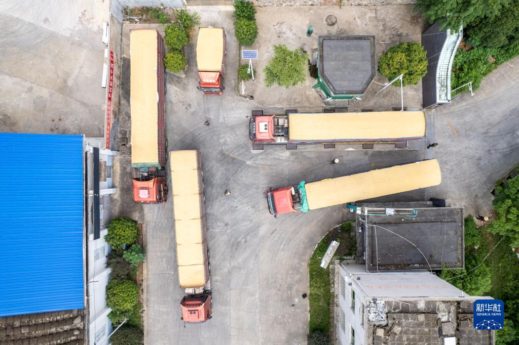 8月7日,運糧車(chē)在湖南安仁國家糧食儲備庫排隊過(guò)磅(無(wú)人機照片)。