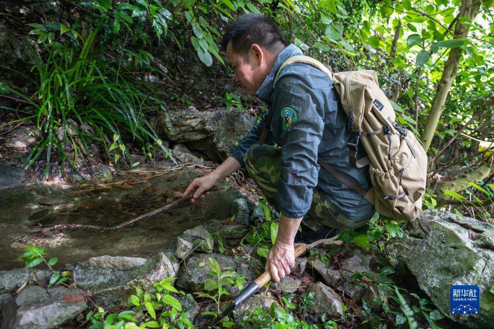 8月4日,梁志章在保護區巡視時(shí),清理專(zhuān)門(mén)為白頭葉猴修的飲水池。