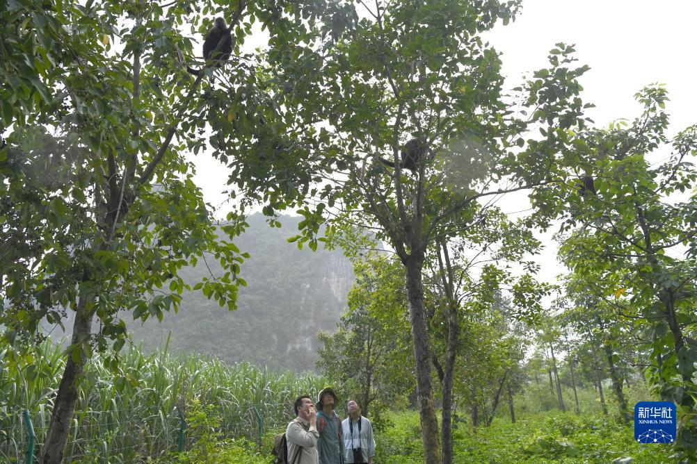 梁志章(左)和李文欽(中)、劉彥辰在觀(guān)察猴群活動(dòng)(8月5日攝)。