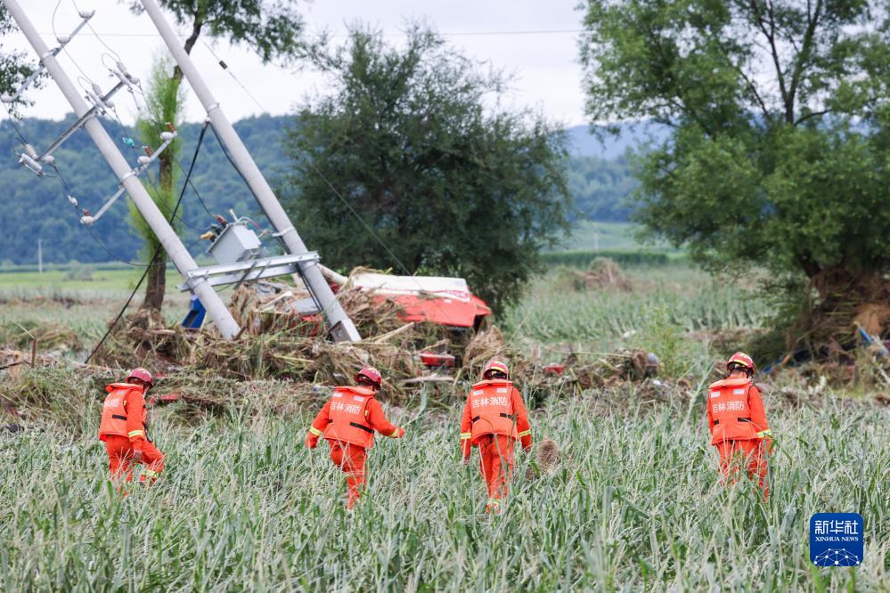 8月6日,吉林市消防救援支隊的消防救援人員在舒蘭市開(kāi)原鎮受災村莊進(jìn)行搜救。