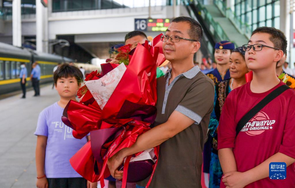 8月7日,在烏魯木齊站,Z180次列車(chē)乘務(wù)人員家屬迎接親人歸來(lái)。新華社記者 王菲 攝