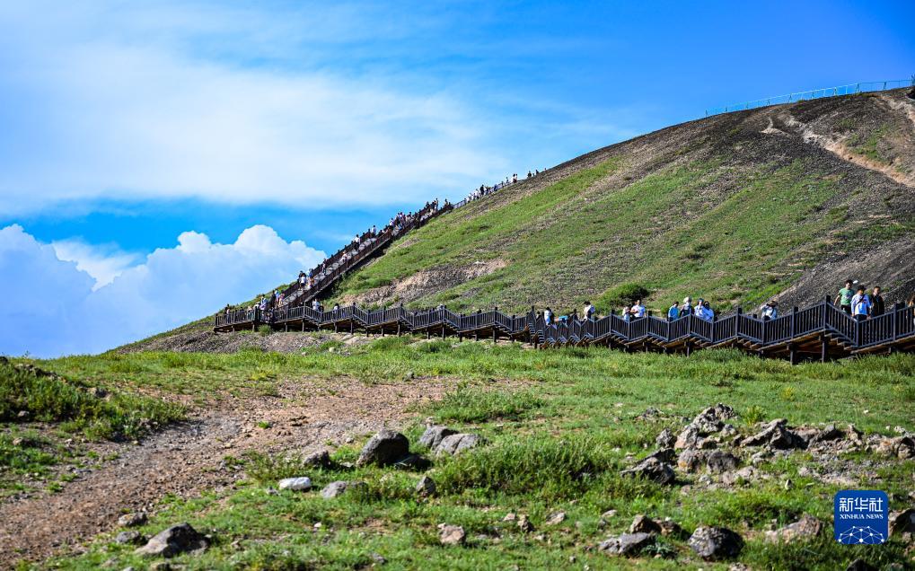 8月6日,游客在排隊攀登烏蘭察布市察哈爾右翼后旗草原上的火山。