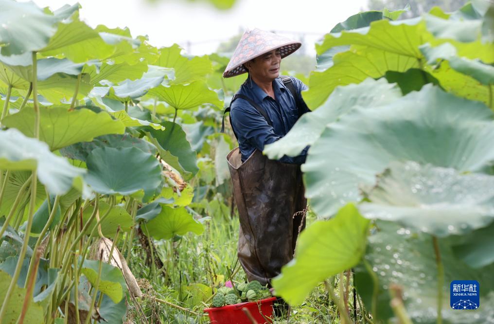 8月8日,浙江省湖州市德清縣康乾街道新琪村村民在荷田中采摘蓮蓬。