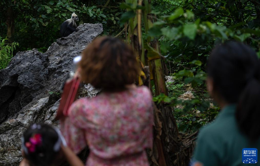 8月5日,在崇左市江州區羅白鄉的白頭葉猴國家級自然保護區,游客在觀(guān)看一只白頭葉猴。