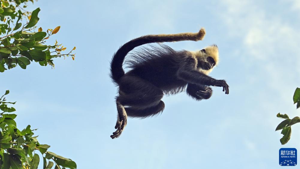 在崇左市江州區羅白鄉的白頭葉猴國家級自然保護區,白頭葉猴在林間飛躍(8月5日攝)。