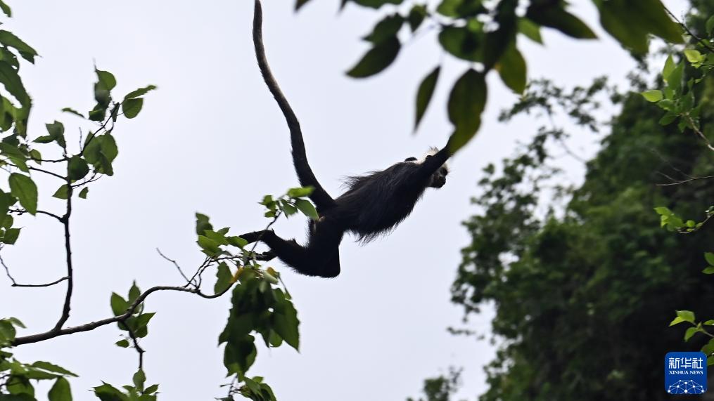 在崇左市江州區羅白鄉的白頭葉猴國家級自然保護區,白頭葉猴在林間飛躍(8月5日攝)。