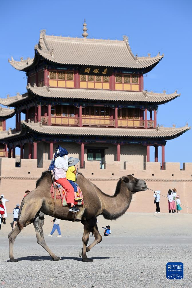8月7日,游客在嘉峪關(guān)關(guān)城外騎駱駝。