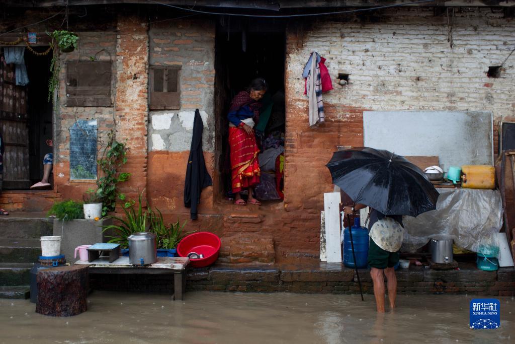 8月8日,在尼泊爾加德滿(mǎn)都,房屋被積水包圍。