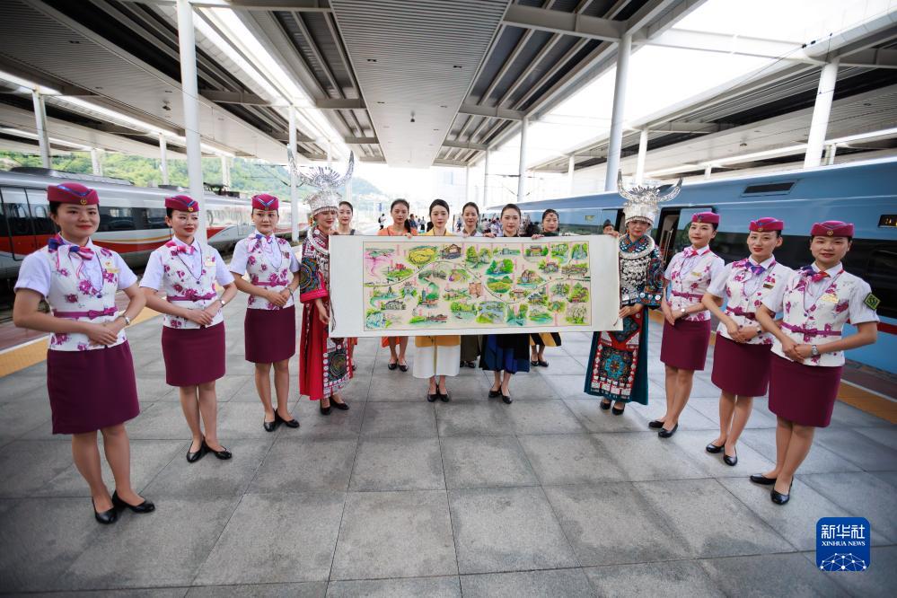8月8日,身著(zhù)民族特色服裝的工作人員在D6155次列車(chē)旁迎接旅客。