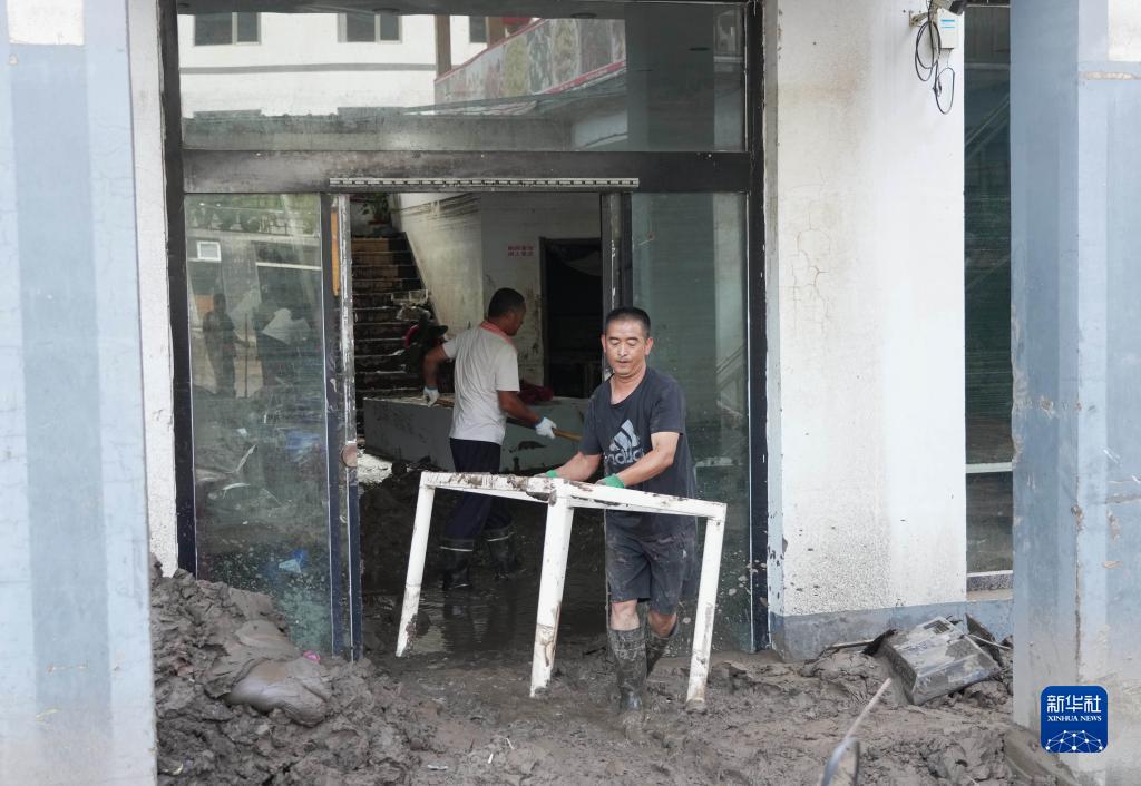 8月8日,淶水縣三坡鎮下莊村的村民在搬運家具。