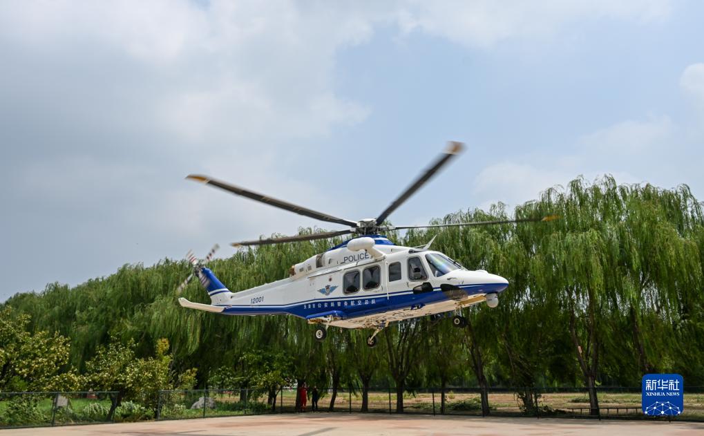 8月8日,在天津市靜海區臺頭鎮,天津市公安局警務(wù)航空總隊直升機起飛準備執行任務(wù)。