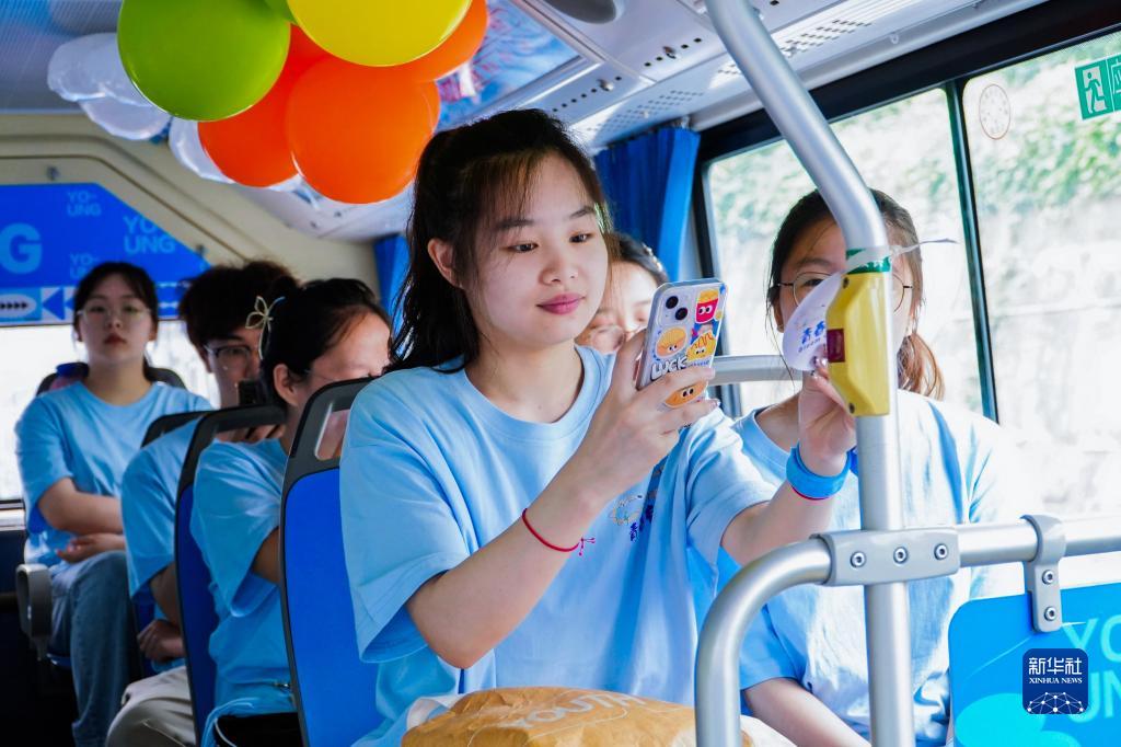 8月8日,大學(xué)生們在“青春巴士”上掃“青春有約”二維碼。