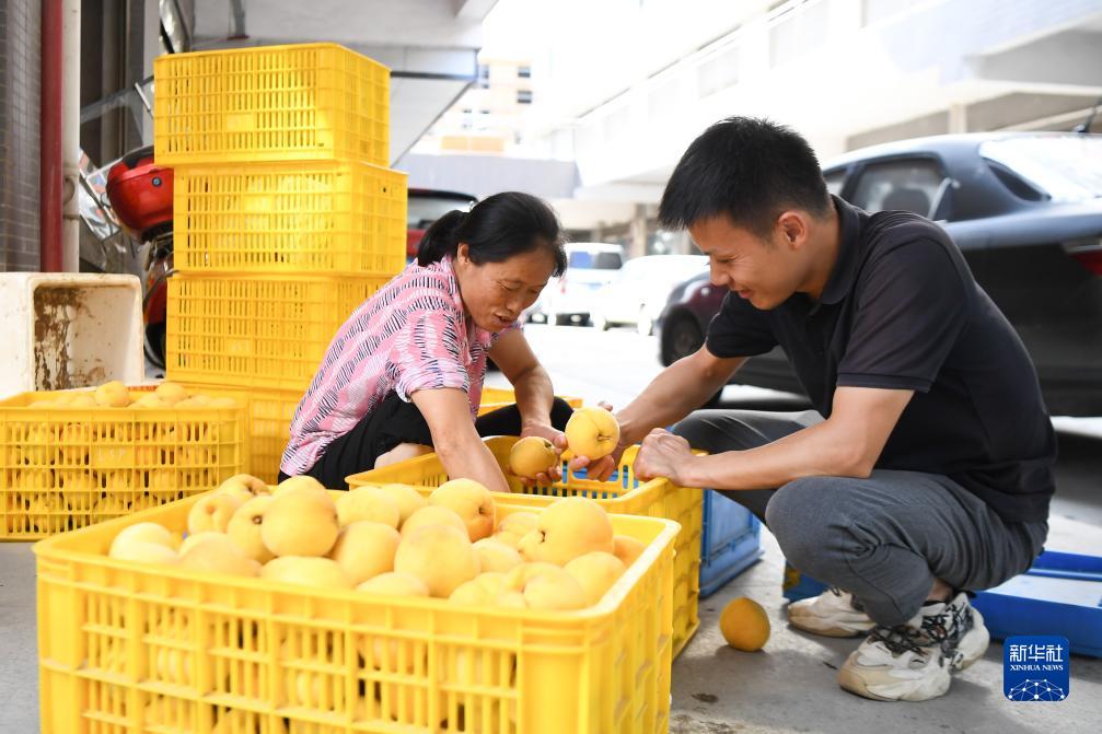 8月7日,桃農在炎陵縣水口鎮黃桃市場(chǎng)挑選黃桃并打包。