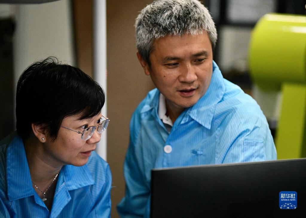 7月22日,在中國科學(xué)技術(shù)大學(xué)上海研究院實(shí)驗室,彭承志(右)與印娟教授查看實(shí)驗數據。