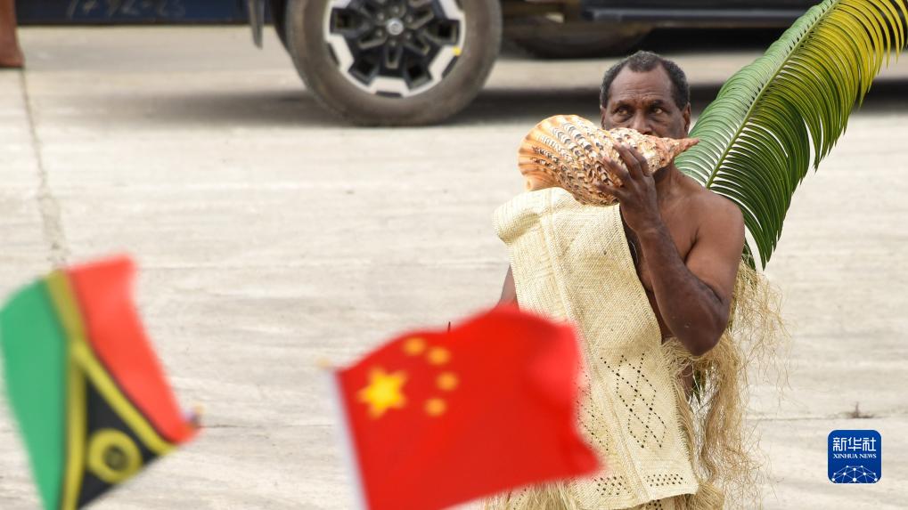 8月8日,中國海軍“和平方舟”號醫院船抵達瓦努阿圖共和國維拉港,一名身著(zhù)傳統服飾的當地男子吹響海螺歡迎中國海軍官兵。