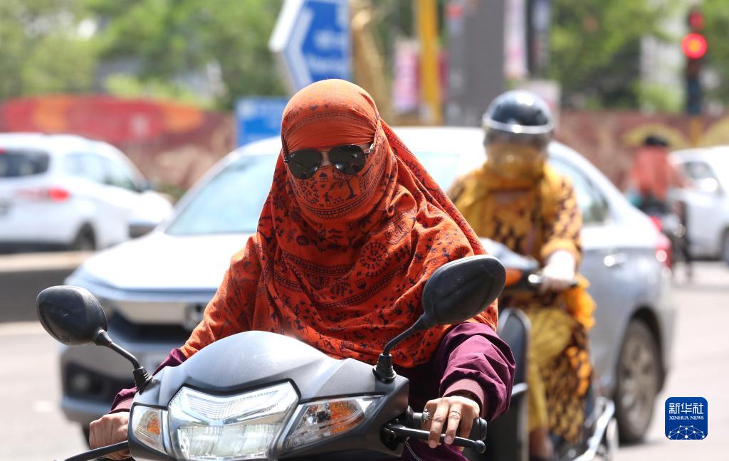 7月6日,在印度博帕爾,騎車(chē)的人們將頭部包裹以遮陽(yáng)防曬。