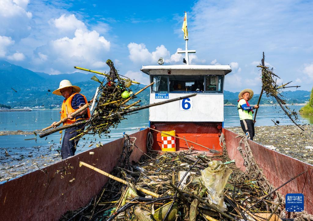 長(cháng)江進(jìn)入主汛期以來(lái),秸桿、樹(shù)枝、塑料等漂浮物隨波逐流,聚集到三峽庫區的江面上。三峽大壩上游的湖北省宜昌市秭歸縣環(huán)保部門(mén)組織清漂工人全力清漂,以減輕漂浮物對三峽樞紐運行的影響,確保三峽水庫水質(zhì)不受污染,保障船舶航行安全。