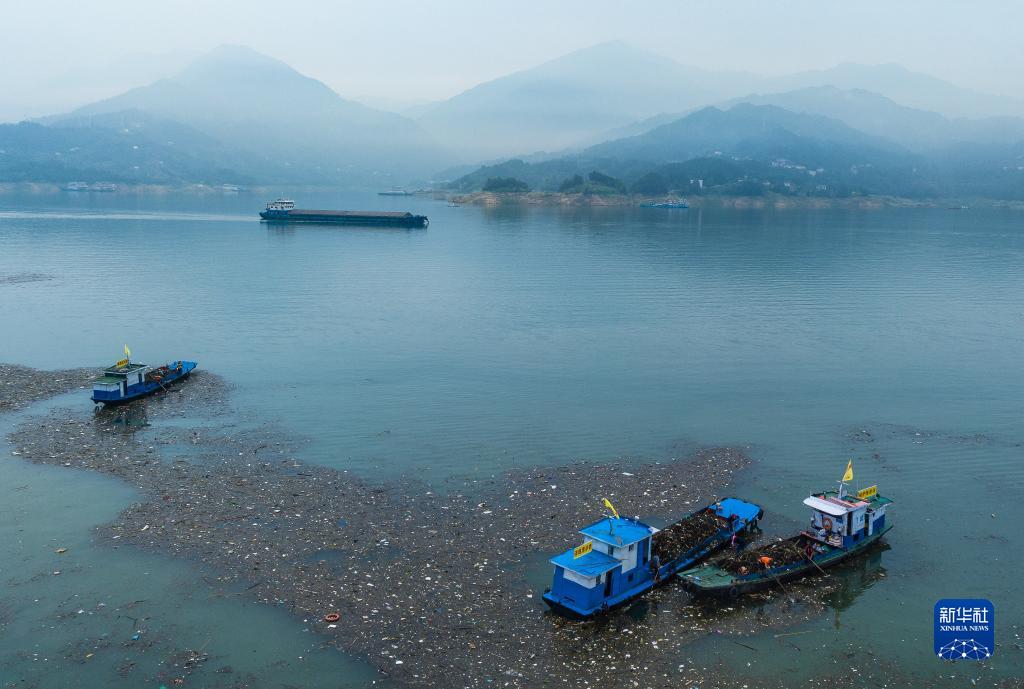 長(cháng)江進(jìn)入主汛期以來(lái),秸桿、樹(shù)枝、塑料等漂浮物隨波逐流,聚集到三峽庫區的江面上。三峽大壩上游的湖北省宜昌市秭歸縣環(huán)保部門(mén)組織清漂工人全力清漂,以減輕漂浮物對三峽樞紐運行的影響,確保三峽水庫水質(zhì)不受污染,保障船舶航行安全。