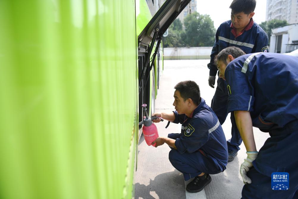 8月9日,河北省涿州市838路公交總站工作人員對車(chē)輛進(jìn)行養護。