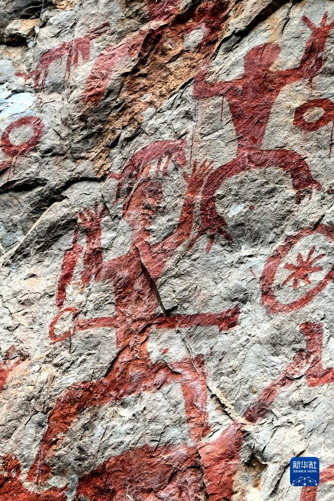 這是廣西崇左市寧明縣的花山巖畫(huà),畫(huà)面表現的是某種儀式(8月8日攝)。