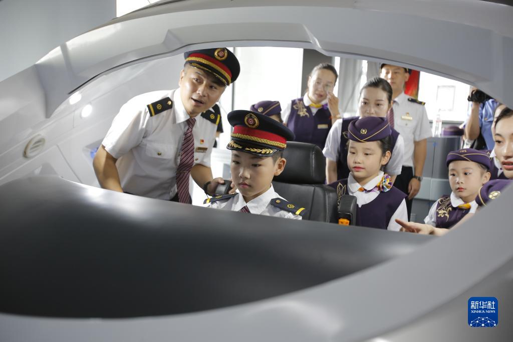 8月8日,小列車(chē)長(cháng)們在南京東機輛段動(dòng)車(chē)運用車(chē)間參觀(guān)模擬駕駛臺,沉浸式體驗動(dòng)車(chē)駕駛仿真器。