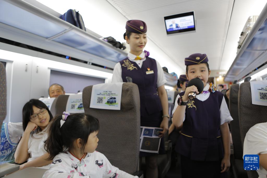 8月8日,小列車(chē)長(cháng)在活動(dòng)中體驗向乘客介紹乘車(chē)規定。