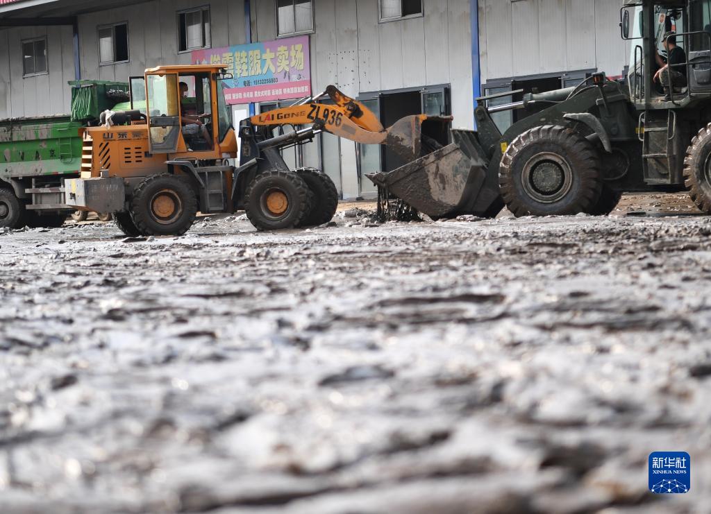 8月9日,車(chē)輛在涿州新發(fā)地大石橋農副產(chǎn)品批發(fā)市場(chǎng)清理淤泥。