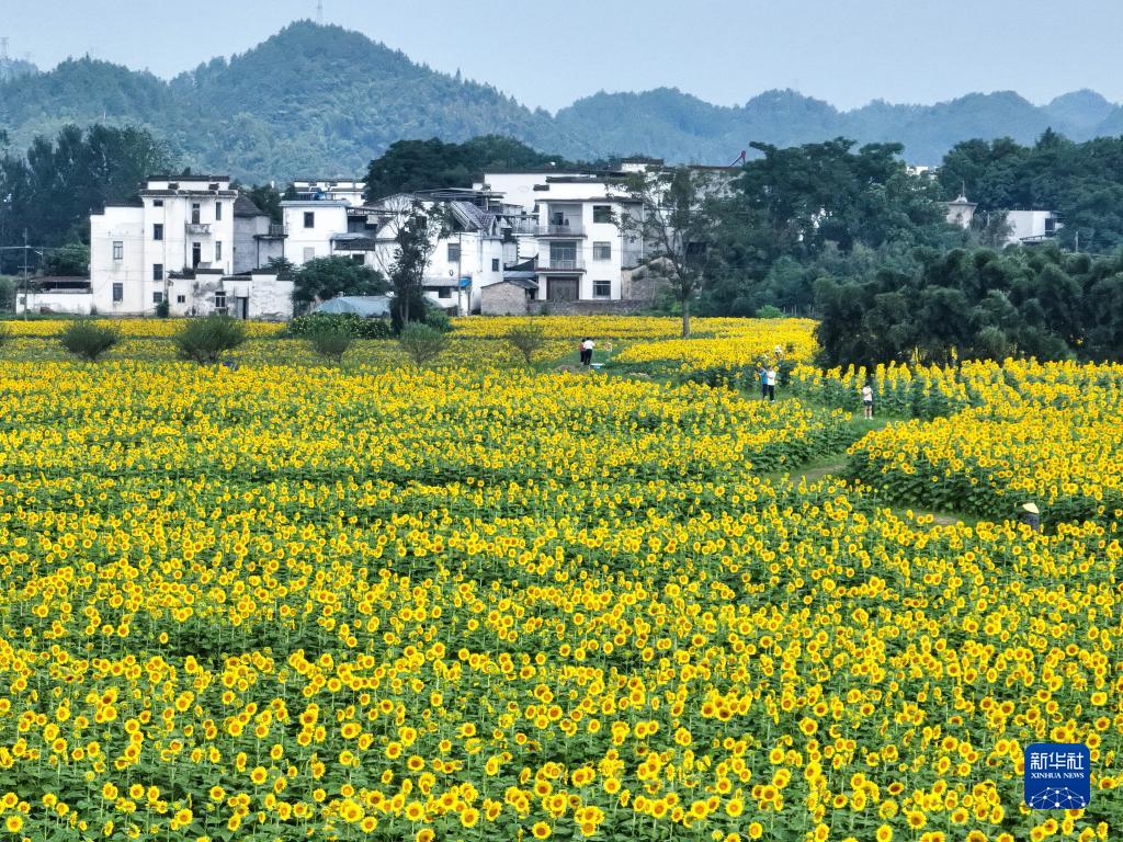 8月9日,游客在安徽省黃山市屯溪區屯光鎮漢沙村欣賞向日葵花海(無(wú)人機照片)。