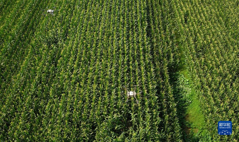 8月9日,在山東省成武縣孫寺鎮,農用植保無(wú)人機在玉米種植田上空進(jìn)行飛防作業(yè)(無(wú)人機照片)。