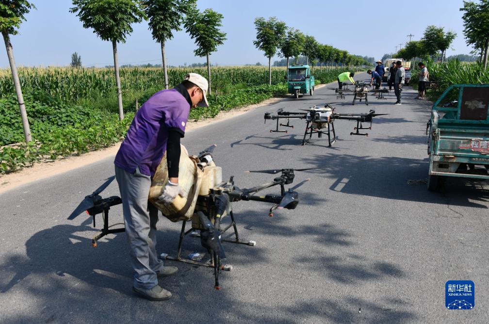 8月9日,在山東省成武縣孫寺鎮,無(wú)人機操作手在做起飛前的準備工作。