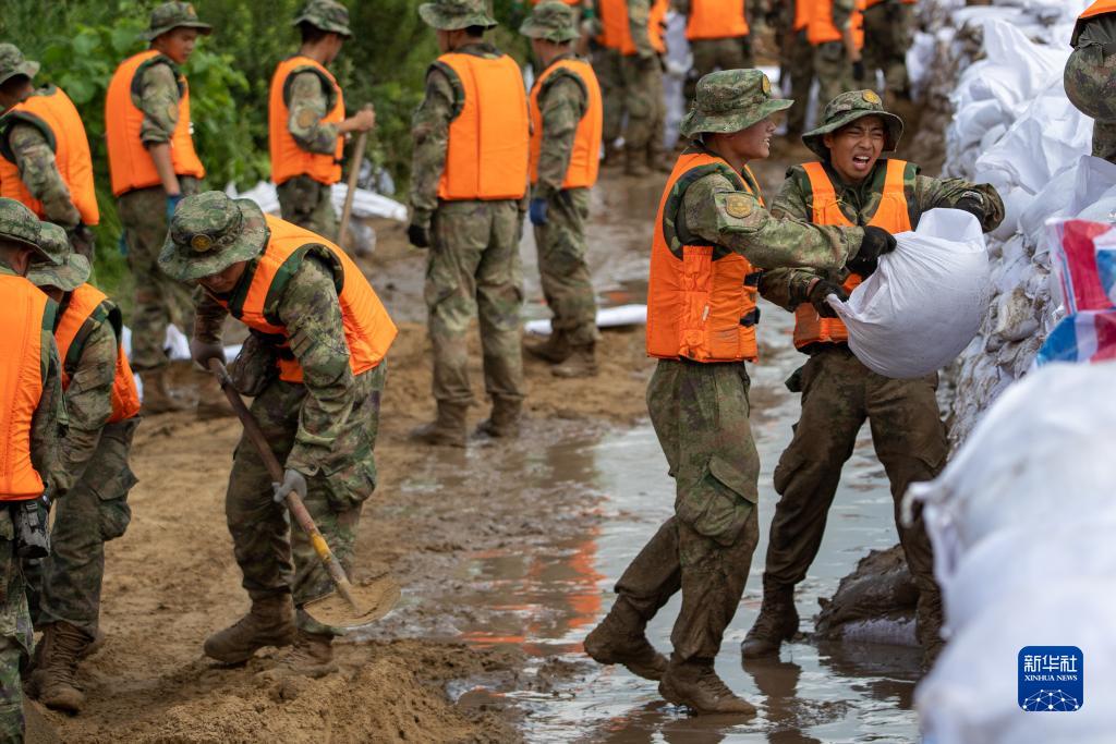 裝滿(mǎn)沙袋,扛上肩頭,疾速前進(jìn)……一名名年輕官兵身穿迷彩服和救生衣,將一個(gè)個(gè)白色沙袋筑成一道長(cháng)約兩公里的“白色長(cháng)城”。8日正午時(shí)分,在黑龍江省哈爾濱市雙城區萬(wàn)隆鄉增產(chǎn)村,來(lái)自陸軍第78集團軍某旅的800余名官兵奮戰在抗洪一線(xiàn)。