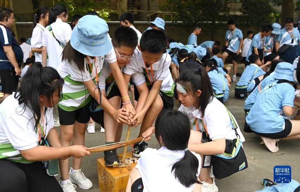 研學(xué)學(xué)生在西安半坡博物館里體驗鉆木取火(8月9日攝)。