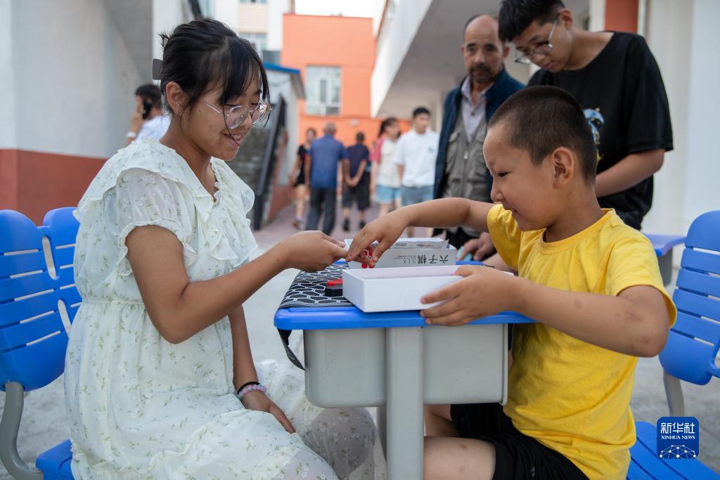 8月9日,小朋友在五常市時(shí)代中學(xué)集中安置點(diǎn)下棋。