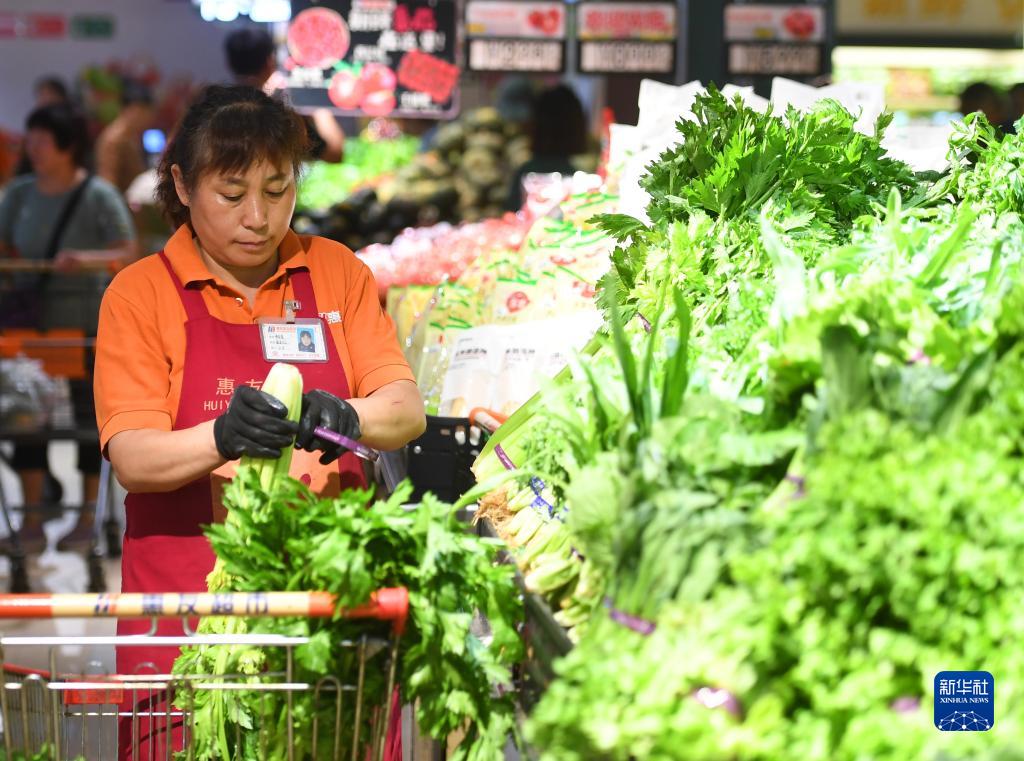 8月10日,涿州市惠友超市鉆石廣場(chǎng)店工作人員在分揀蔬菜。