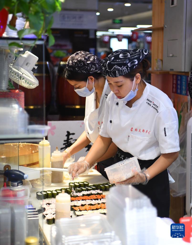 8月10日,在涿州市惠友超市鉆石廣場(chǎng)店,一家壽司店工作人員在制作壽司。