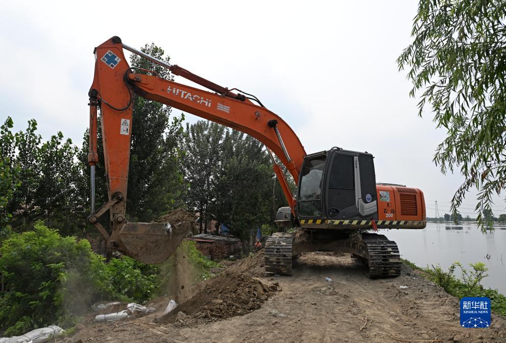 8月10日,在天津市靜海區大清河臺頭段南堤,工程機械設備在堤壩上作業(yè)。