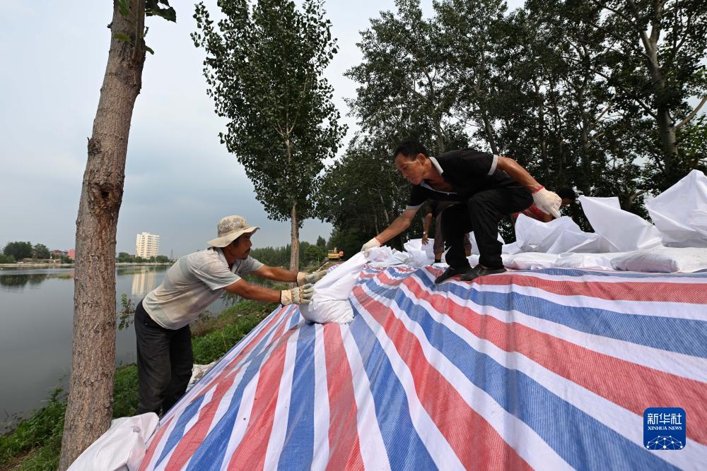 8月10日,在天津市靜海區大清河臺頭段南堤,抗洪人員在加固堤壩。