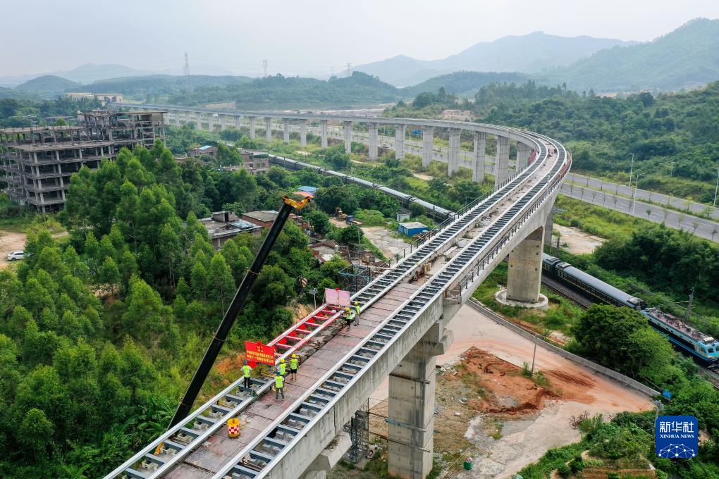 8月10日,廣東清遠磁浮旅游專(zhuān)線(xiàn)最后一榀軌排被吊裝到橫跨京廣鐵路的長(cháng)隆特大橋上(無(wú)人機照片)。