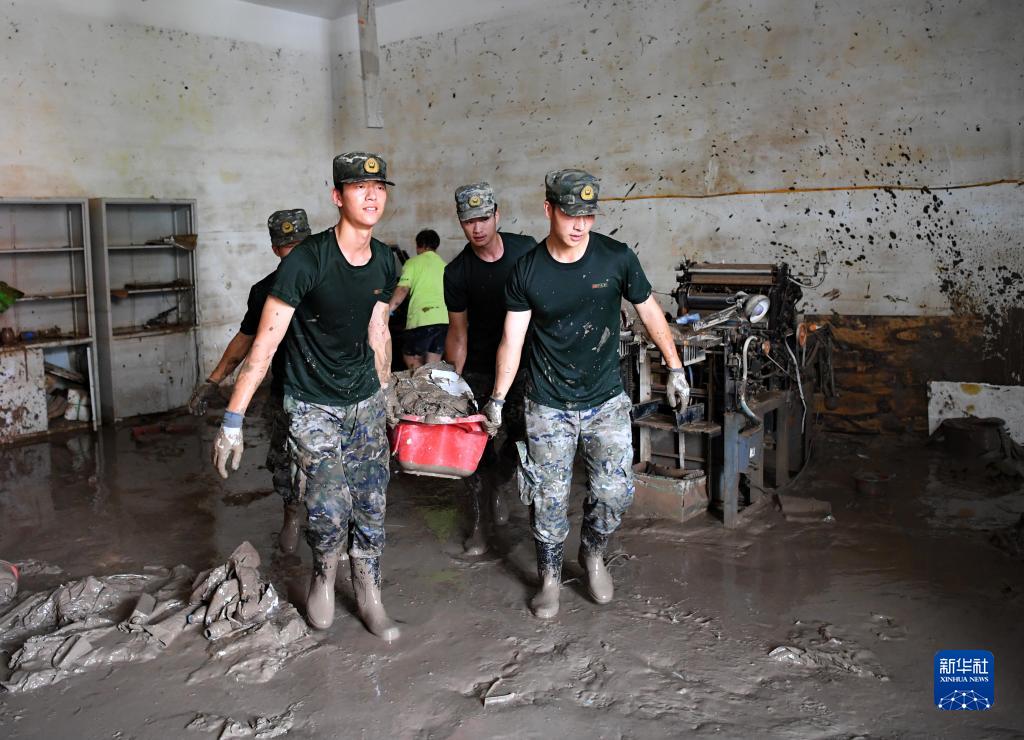 8月10日,武警河北總隊保定支隊戰士在涿州中學(xué)教學(xué)樓清理垃圾。